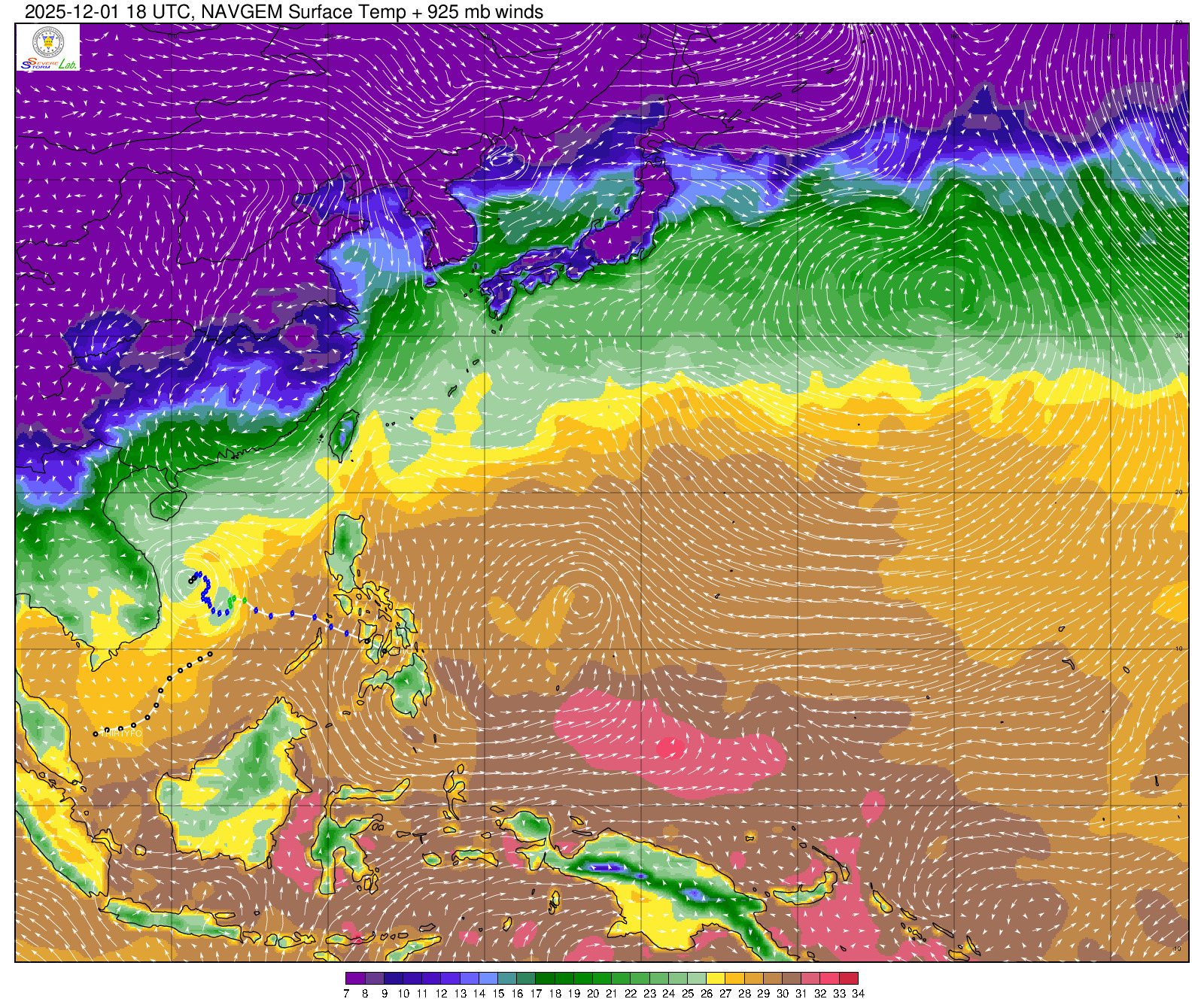 2025/12/01 18z sfctemp 地/海面溫度+925風場