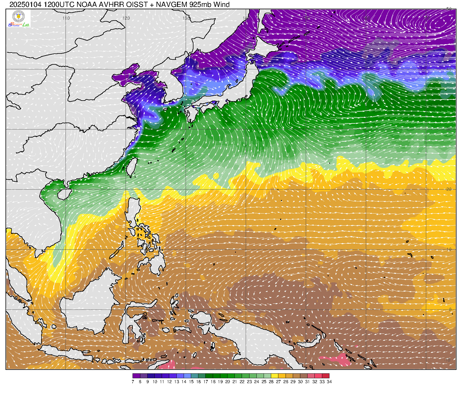 2025/01/04 12Z OISST海溫+925mb風場