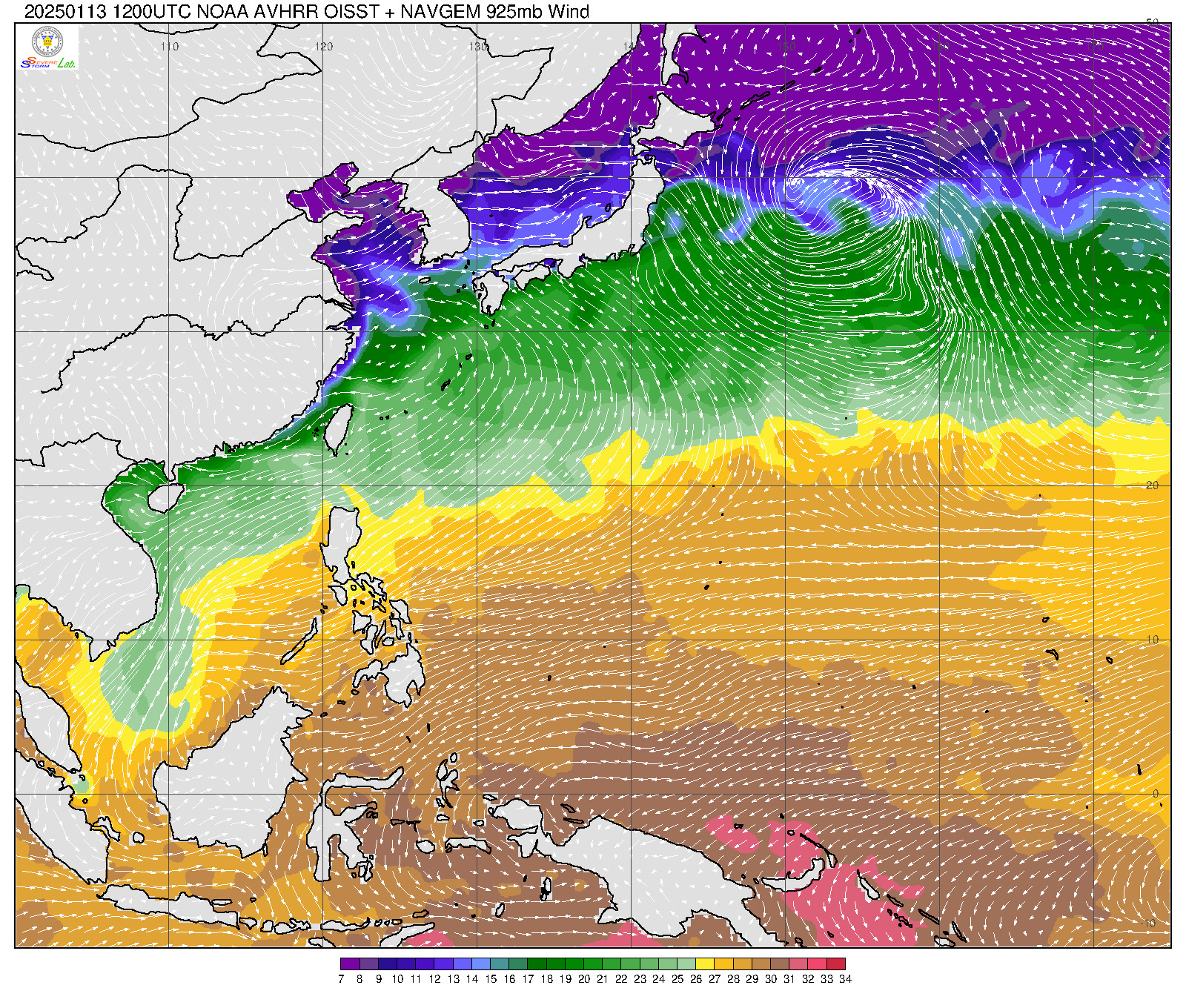 2025/01/13 12Z OISST海溫+925mb風場