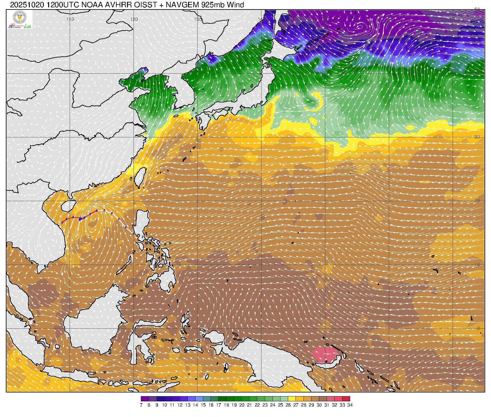 2025/10/20 12Z OISST海溫+925mb風場