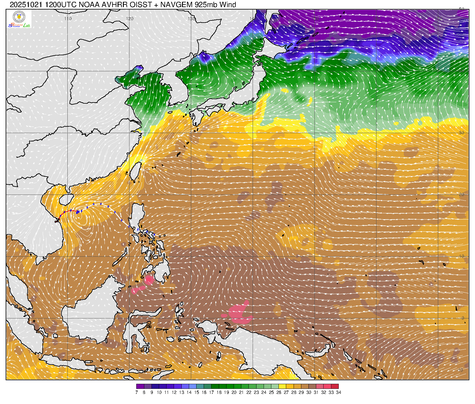 2025/10/21 12Z OISST海溫+925mb風場